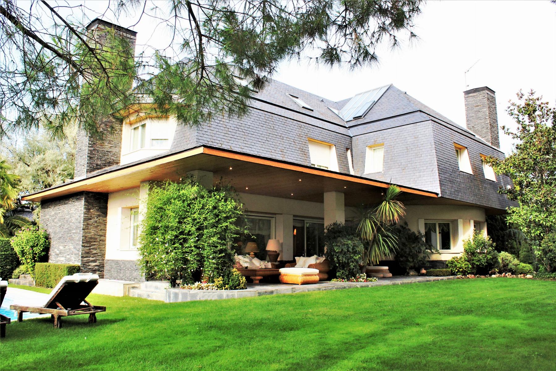 Exclusive independent villa in the Parque Conde de Orgaz, created to live with the luxury of its wide spaces, the comfort of its noble materials and the tranquility that gives it an unbeatable location. Elevator, four suites (8), eight bathrooms, two lounges, large gym, semicircular cellar, Turkish bath, changing room and pool bath, built-in barbecue, service area with separate entrance. Released in 2002, with an area of almost 1,000 m2 and built on a plot of more than 1,000 m2 with 70 meters of façade, based on a solid and exclusive foundation by piles and perimeter support, without any interior pillar or column, therefore Without the partition, its floors are completely open and adaptable to all kinds of needs of its inhabitants. It has a garden made by a landscaping studio, equipped with a pond with a waterfall, a pool with purified water with the ion system (Cu), different tree species, hedges and meadows of natural grass. On the main floor (+/- 320 m2 and 3.30 m high) stands out a porch of about 45 m2 with natural slate floor, which communicates with an open-plan living room of more than 90 m2, various rooms and connected to its Once with the dining room and the semicircular hall-hall, of about 40 m2 and equipped with overhead light from a large skylight on the deck. This floor is completed by a courtesy toilet and the pleasant kitchen, also semicircular, equipped with an office, pantry and cleaning supplies room, with Leitch furniture and Silestone worktop. The first floor (+/- 225 m2) is accessed through a comfortable staircase and also by elevator, and is where the three large suites are located, the main one with a semicircular bathroom equipped with a separate bathtub and shower and both with hydromassage, dressing room, dressed wardrobes and tiled bathrooms lined with aged marble. We access the second floor from the stairs or the elevator and it has a spacious living room with an English atmosphere (billiards and TV), a table games room, an office, closets and a courtesy toilet. These three floors and the staircase are floored with solid mahogany sucupira flooring, tracked in the Spanish style, 22 mm thick and 19 cm wide. The basement (+/- 345 m2), has a service area (washing, ironing, warehouse, installation room, elevator room, bedroom and service bathroom), large gym, semicircular cellar, Turkish bath, changing room and bathroom of swimming pool, room with battery of wardrobes, rain reservoir (30 m3) and garage for 4/5 cars. The entire building is heated with air conditioning cold / heat of natural gas through ducts, adjustable and programmable in each living space. Tilt-and-turn windows in lacquered wood on the inside and lacquered aluminum on the outside, with metal security and motorized shutters. Lacquered solid wood doors. Alarm sectorized by plants. Parque Conde de Orgaz.- Its privileged location, in a unique, quiet residential environment, surrounded by public parks and only ten minutes from the center of Madrid, with easy and fast access to the A-2, M-40, IFEMA fairgrounds , airport, etc., make it the prime residential area in the Northeast of the capital and the most desired by families seeking tranquility, exclusivity, communications, a social environment, ... It is endowed with the best facilities and services, as famous clinics and health centers, shopping centers, public and private sports facilities, renowned schools, bilingual nurseries, 15 movie theaters, restaurants, banks, ...